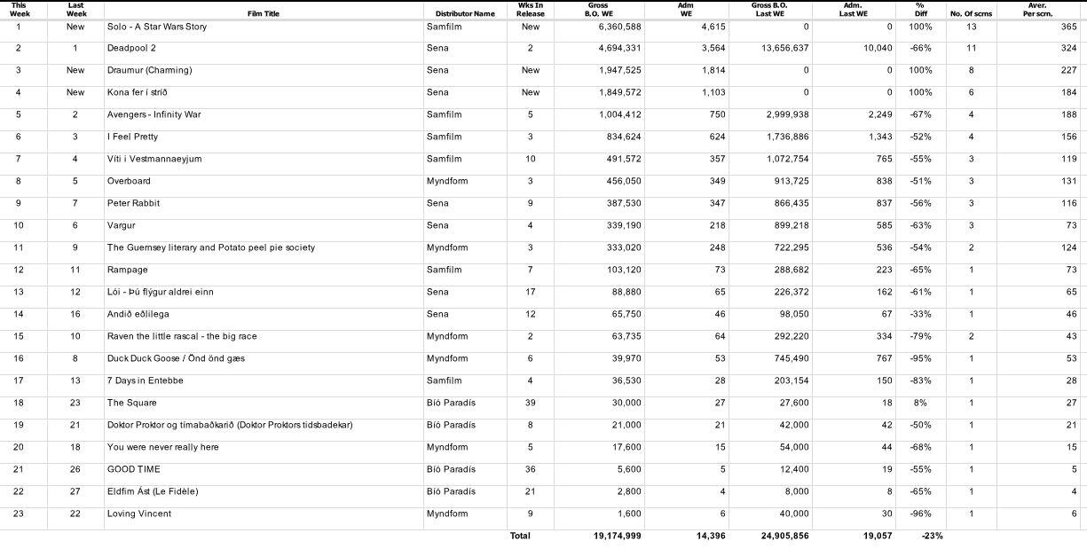 Það er skammt stórra högga á milli á íslenska bíóaðsóknarlistanum. Í síðustu viku brunaði ofurhetjan Deadpool beint á toppinn í Deadpool 2, en núna er kominn nýr fógeti í bæinn, sjálfur Han Solo í Star Wars hliðarmyndinni Solo: A Star Wars Story. Beint í þriðja sætið fer svo teiknimyndin Draumur.