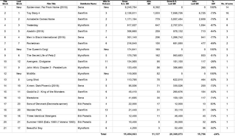 Ný kvikmynd um Spider-Man, Spider-Man: Far from Home, er komin í bíó, og gerði aðalhetjan, sjálfur köngulóarmaðurinn, sér lítið fyrir og sveiflaði sér á topp íslenska bíóaðsóknarlistans.  Toppmynd síðustu tveggja vikna, Toy Story 4 , þarf því að sætta sig við annað sæti listans þessa vikuna.