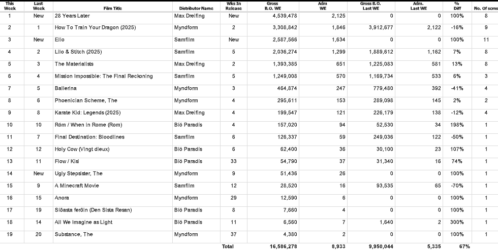 Uppvakningahrollurinn 28 Years Later kom sá og sigraði á íslenska bíóaðsóknarlistanum um nýliðna helgi. Ríflega 2.100 manns komu í bíó að sjá myndina og borguðu fyrir það rúmlega 4,5 milljónir í aðgangseyri.