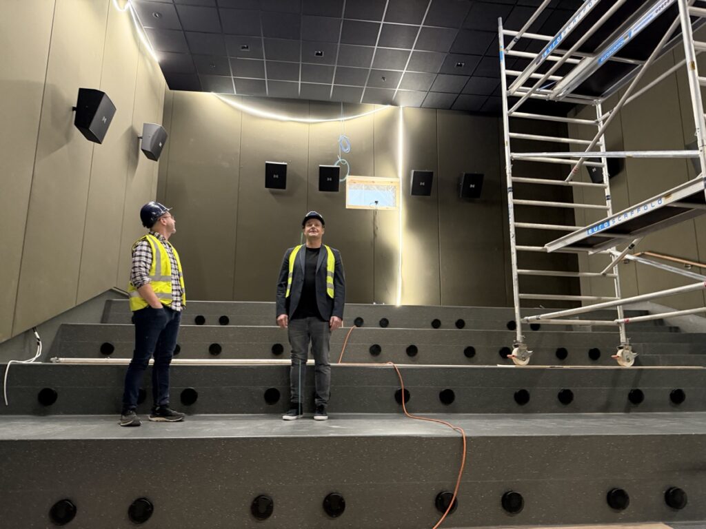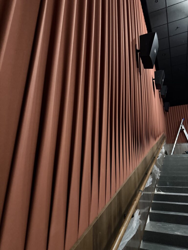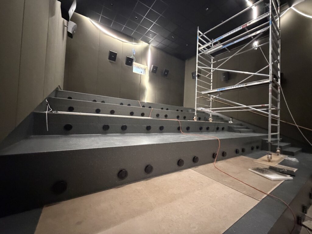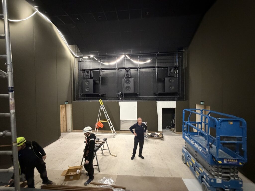 Eins og sést á meðfylgjandi myndum er búið að koma fyrsta flokks nýju Dolby Atmos hljóðkerfi fyrir á bakvið bíótjaldið, á veggi og loft, en um er að ræða fullkomnasta hljóðkerfi sem völ er á í dag fyrir bíóhús.