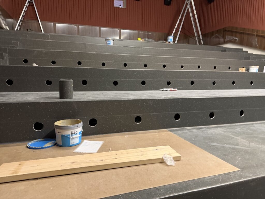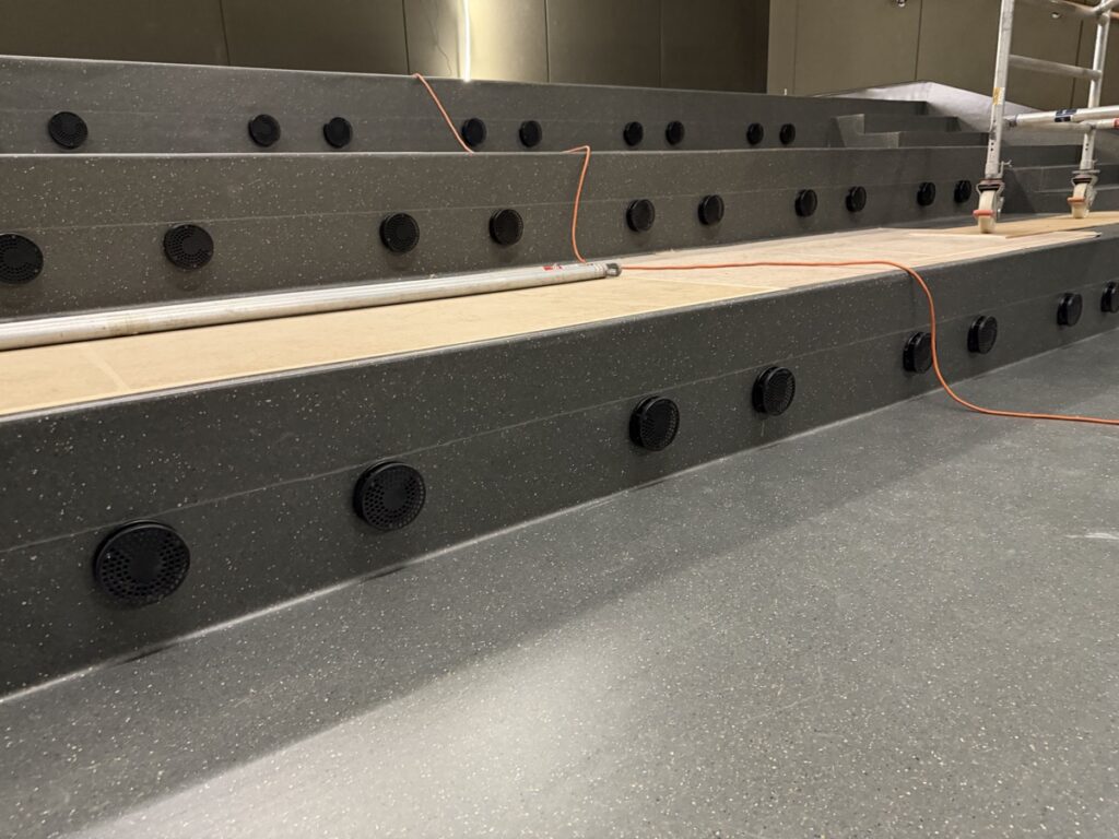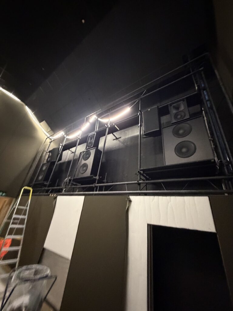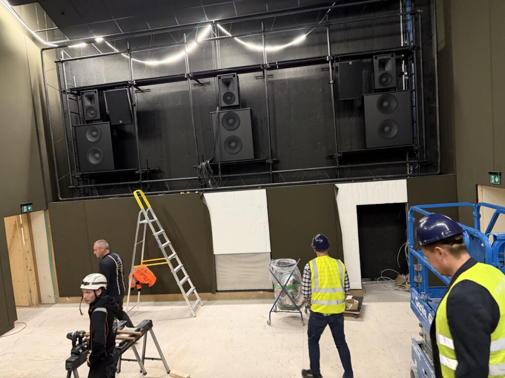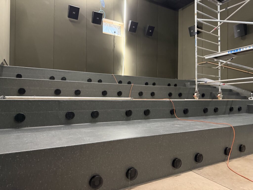 Eins og sést á meðfylgjandi myndum er búið að koma fyrsta flokks nýju Dolby Atmos hljóðkerfi fyrir á bakvið bíótjaldið, á veggi og loft, en um er að ræða fullkomnasta hljóðkerfi sem völ er á í dag fyrir bíóhús.