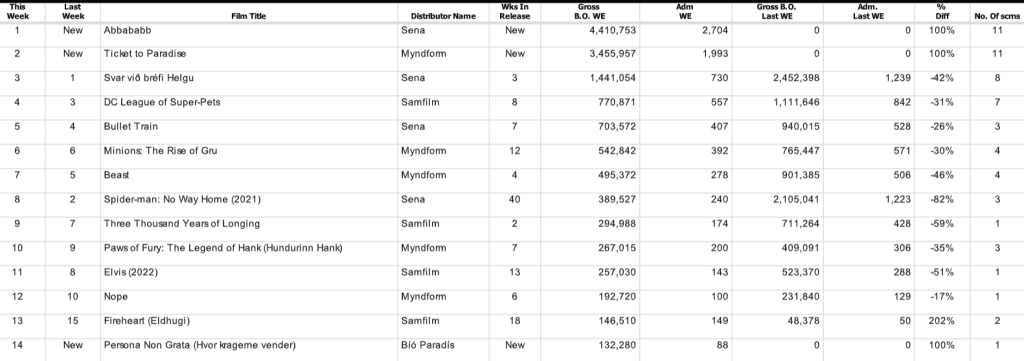 Um einni milljón króna munaði á myndunum í tekjum en 2.700 manns sáu Abbababb á meðan tæplega tvö þúsund horfðu á Ticket to Paradise, sem er einnig ný á lista.