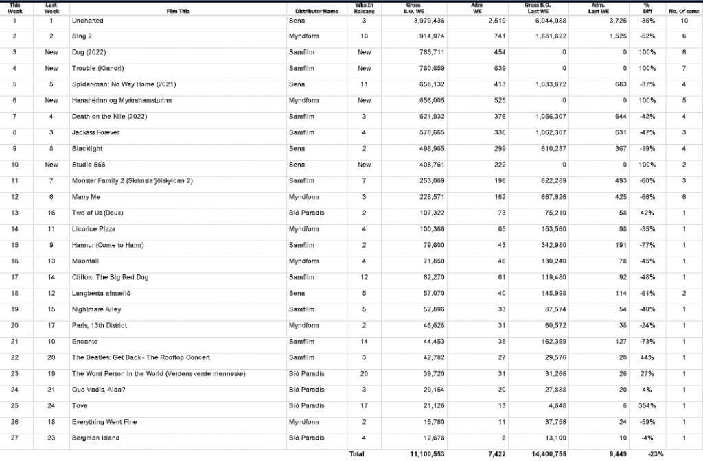 Uncharted heldur sæti sínu auðveldlega á toppi íslenska bíóaðsóknarlistans með fjórfalt meiri tekjur en myndin í öðru sæti, sem er Syngdu 2. Hún hefur nú verið hefur á listanum í tíu vikur samfleytt!