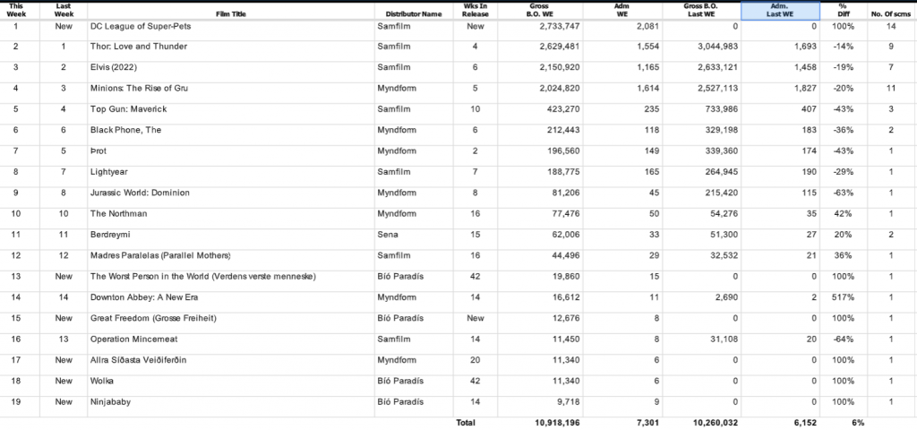 Thor: Love and Thunder, hin litríka og skemmtilega ofurhetjumynd frá Marvel, þurfti því að gera sér annað sætið að góðu eftir þrjár vikur á toppinum.