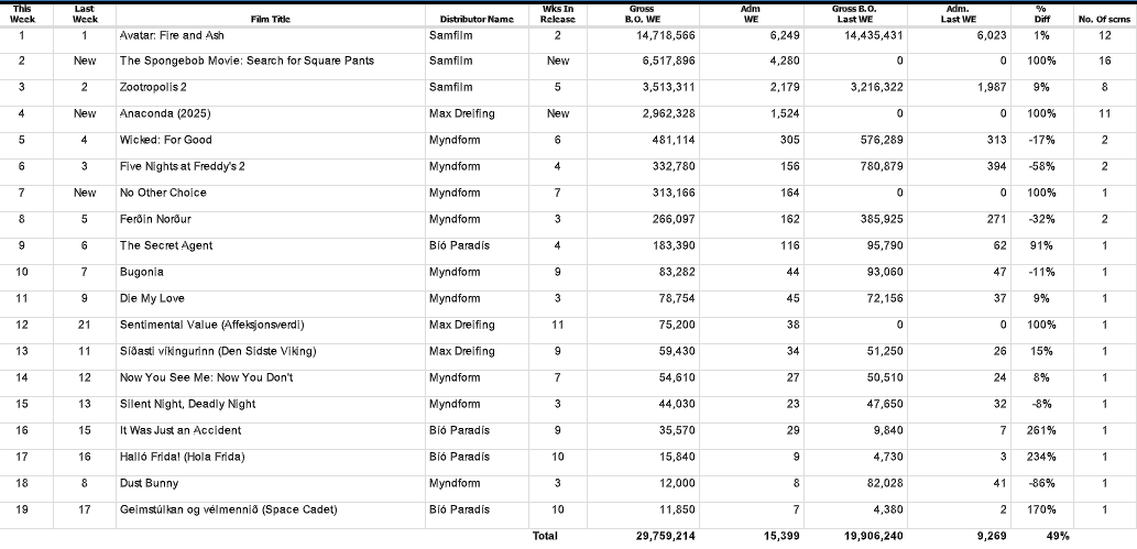Stórmynd James Cameron, Avatar: Fire and Ash, trónir enn á toppi íslenska bíóaðsóknarlistans aðra vikuna í röð. Myndin er sú langvinsælasta í bíó en nærri 6.300 manns sáu kvikmyndina um síðustu helgi. Heildartekjur eru komnar upp í 42,5 milljónir króna.