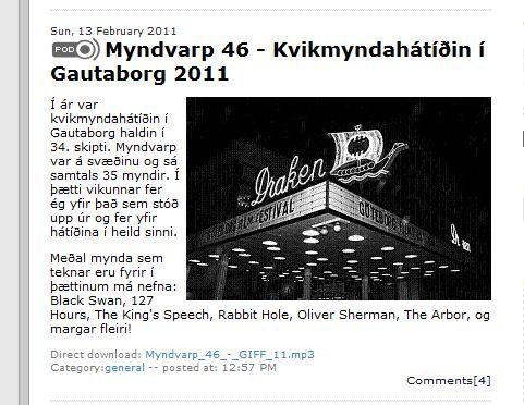 Kvikmyndahátíðin í Gautaborg hefur verið í aðalhlutverki í þremur síðustu Myndvarpsþáttum Ara Gunnars Þorsteinssonar. Myndvarp eru svokallað hlaðvarp – þ.e. einskonar útvarpsþættir á netinu. Ari Gunnar sá einar 35 kvikmyndir á hátíðinni, og fjallar hann um það sem stóð upp úr á hátíðinni að hans mati.