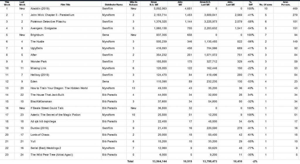 Disney ævintýramyndin Aladdin, um þjófinn og „strætisrottuna“ Aladdin, Jasmín prinsessu og bláa andann í glasinu, fór beint á topp íslenska bíóaðsóknarlistans nú um helgina, og ýtti þar með John Wick: Chapter 3 – Parabellum niður í annað sæti listans.