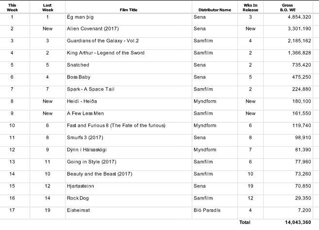 Myndin hratt þar með áhlaupi nýrrar myndar, geimtryllisins Alien: Covenant, sem fór beint í annað sæti listans. Í þriðja sæti, sína fjórðu viku á lista, sitja svo útverðir alheimsins í Guardians of the Galaxy – Vol 2.