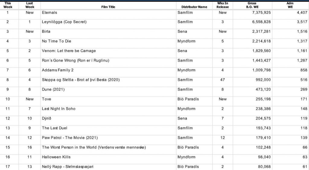 Marvel ofurhetjumyndin Hin Eilífu, eða Eternals, rauk beint á topp íslenska bíóaðsóknarlistans um síðustu helgi og skákaði þar með íslensku myndinni Leynilöggu sem átti toppsætið tvær helgar þar á undan. Leynilögga færðist niður í annað sætið, en tæplega þúsund fleiri sáu Eternals en Leynilöggu nú um helgina.