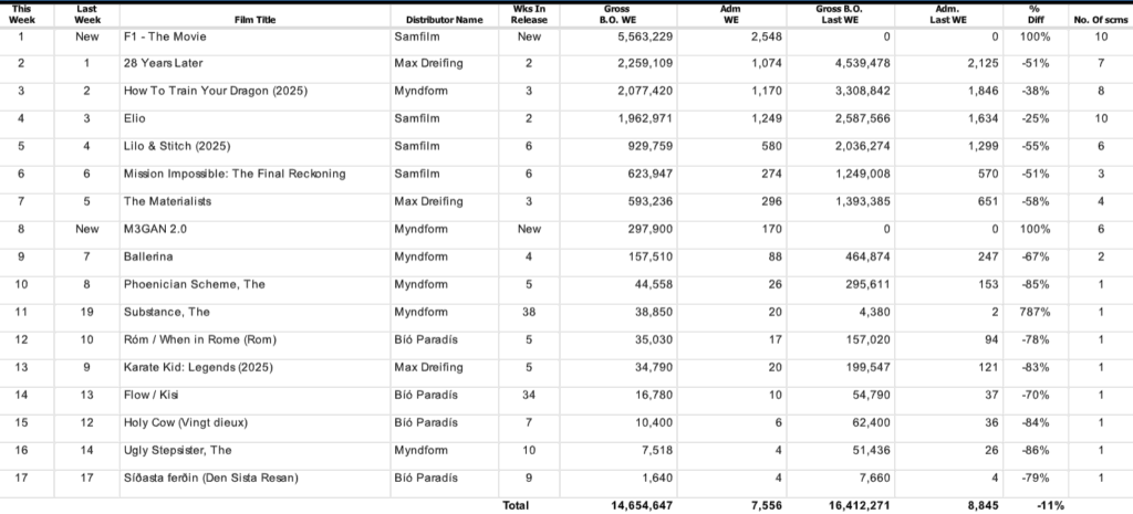 Kappakstursmyndin F1 brunaði beint á topp íslenska bíóaðsóknarlistans um síðustu helgi og sendi þar með hrollvekjuna 28 Years Later niður í annað sætið.