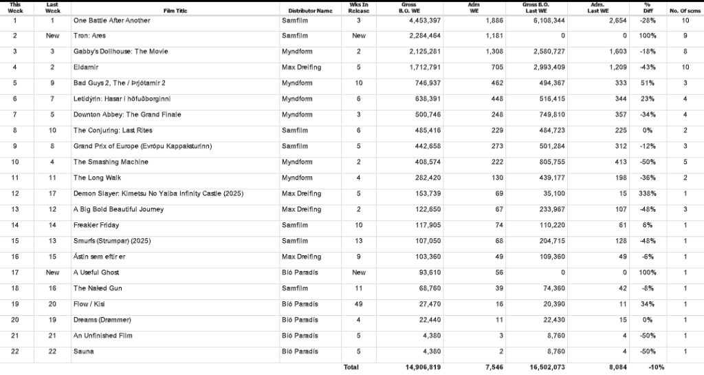 Í öðru sæti er framtíðarmyndin Tron: Ares, ný á lista.