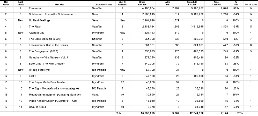 Frumefnin í teiknimyndinni Elemental voru vinsælust í bíó um síðustu helgi hér á landi en næstum því þrjú þúsund manns borguðu sig inn á myndina og tekjur voru 4,5 milljónir króna.