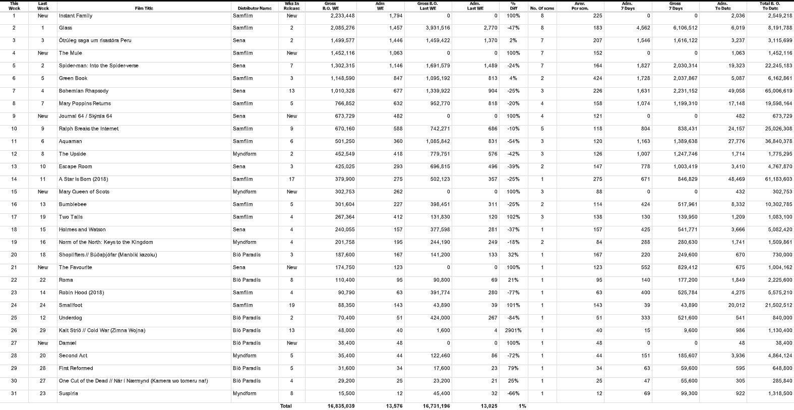 Fimm aðrar nýjar myndir auk Instant Family eru á listanum að þessu sinni. Í fjórða sæti er The Mule, með Clint Eastwood í aðalhlutverki, í níunda sæti er danska spennumyndin Skýrsla 64, þá er í 15. sæti hin sögulega Mary Queen of Scots, í tuttugasta og fyrsta sæti situr hin Óskarstilnefnda The Favourite og að lokum er það Damsel sem fer beint í 27. sæti listans.