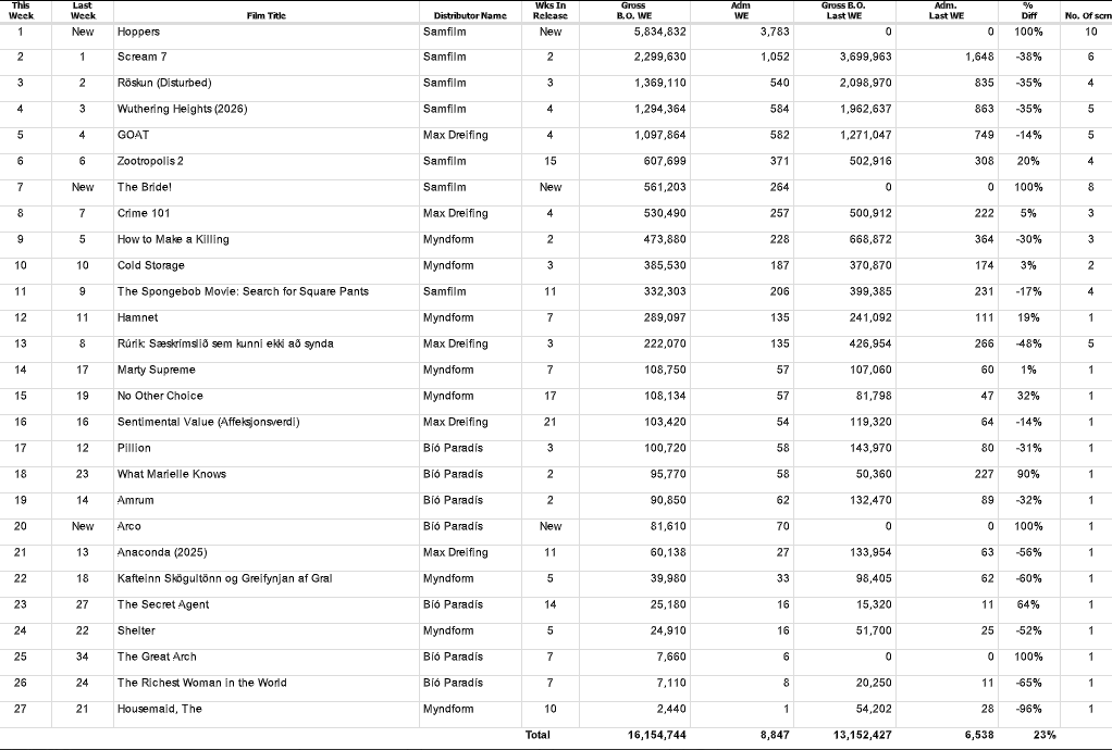 Toppmynd síðustu viku, Scream 7, fór niður í annað sætið og Röskun, seig líka niður um eitt sæti.