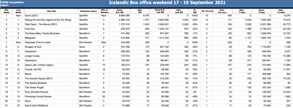 Stórmyndin Dune opnaði á Íslandi og annars staðar í Evrópu um helgina, mánuði áður en hún kemur í bíó í Bandaríkjunum. Á Íslandi náði hún stærstu opnun síðan um jólin 2019 (Star Wars: The Rise of Skywalker).
