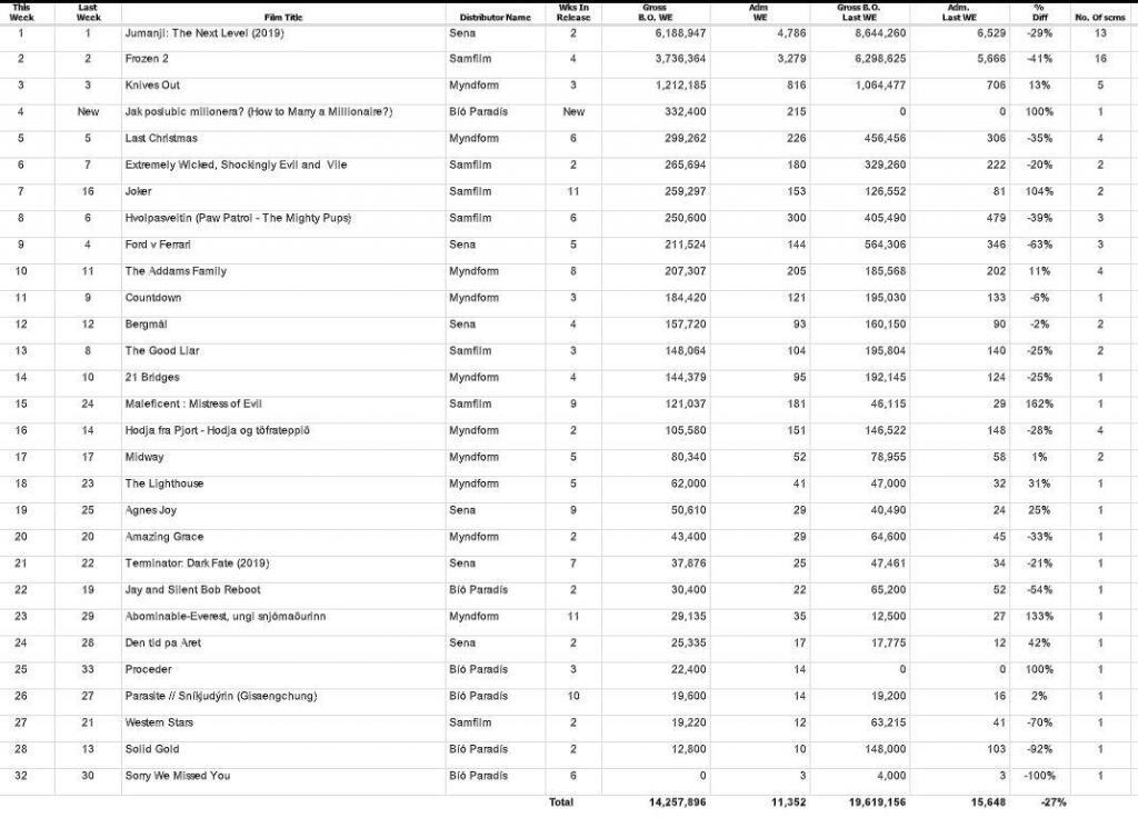 Toppmynd síðustu viku, ævintýramyndin Jumanji: The Next Level, er traust á toppi íslenska bíóaðsóknarlistans aðra vikuna í röð, en nýr listi var gefinn út nú í byrjun vikunnar. Þess ber þó að geta að engin ný Hollywoodmynd bættist í bíóhús landsmanna fyrir síðustu helgi.
