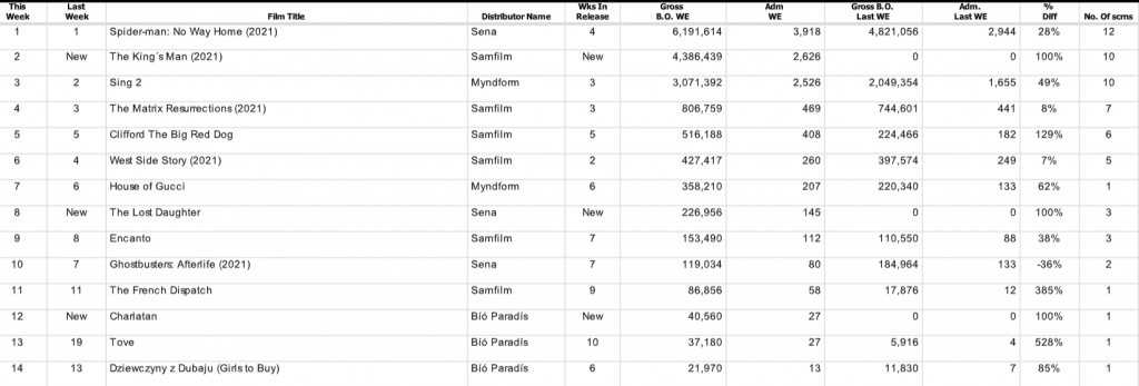 Fjórðu vikuna í röð er Spider-Man: No Way Home vinsælasta kvikmyndin á Íslandi. Það kemur reyndar ekki mikið á óvart miðað við þær góðu viðtökur sem myndin hefur fengið bæði hjá gagnrýnendum og almenningi.