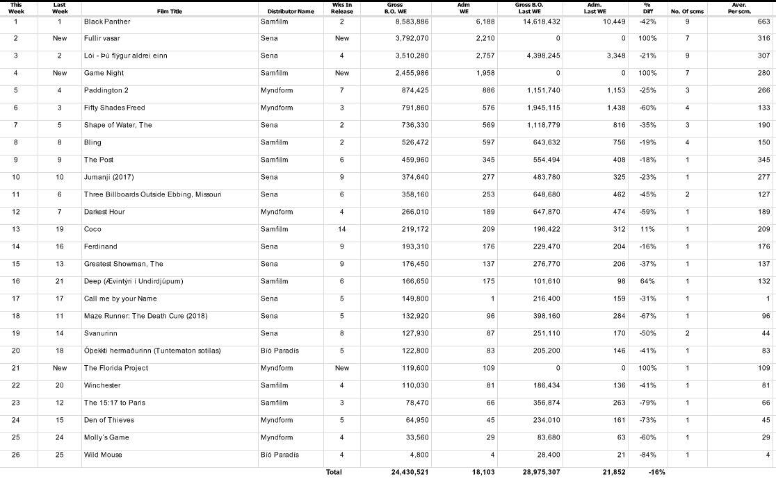 T´Challa, konungurinn í Wakanda, öðru nafni Svarti pardusinn, ríkir enn á toppi íslenska bíóaðsóknarlistans, en kvikmyndin Black Panther hefur slegið rækilega í gegn hér á landi sem og annarsstaðar.
