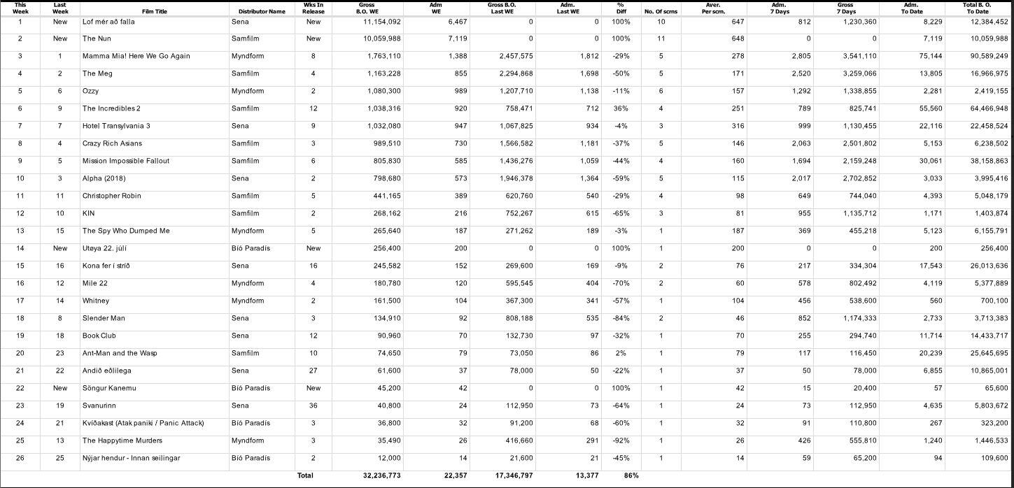 Auk Lof mér að falla og The Nun eru tvær nýjar myndir til viðbótar á bíóaðsóknarlistanum. Myndin um fjöldamorðin í Útey í Noregi fór beint í 14. sæti listans, og íslenska heimildarmyndin Söngur Kanemu fór beint í 22. sætið.