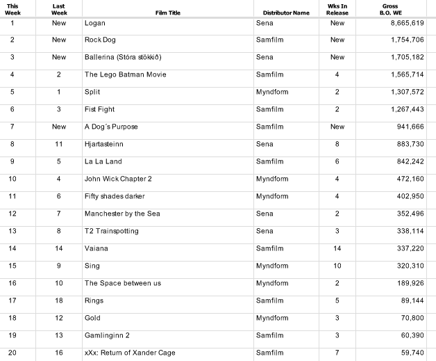 Þrjár nýjar kvikmyndir raða sér í þrjú efstu sæti íslenska bíóaðsóknarlistans þessa helgina, en af þeim trónir ofurhetjumyndin Logan hæst, með langmesta aðsókn. Tekjur af sýningum myndarinnar námu nálægt níu milljónum íslenskra króna nú um helgina, en næsta mynd á eftir, Rock Dog, þénaði tæpar tvær milljónir króna. Skammt undan kom svo teiknimyndin Stóra stökkið í þriðja sætinu.