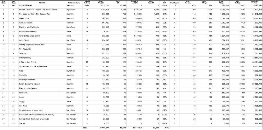 Kraftmesta ofurhetjan í Marvel heiminum, Captain Marvel, í túlkun Óskarsverðlaunaleikkonunnar Brie Larson, flaug rakleiðis á topp íslenska bíóaðsóknarlistans nú um helgina, en myndin er að slá aðsóknarmet hvert sem litið er þessa dagana. Tekjur myndarinnar yfir helgina hér á Íslandi námu um 14,5 milljónum króna, sem er frábær árangur.