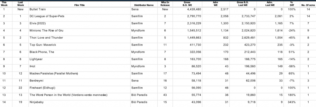 Gríntryllirinn Hraðlestin, eða Bullet Train gerði sér lítið fyrir og fór beint á topp íslenska bíóaðsóknarlistans um síðustu helgi og sló þar með út DC League of Super-Pets sem var búin að koma sér notalega fyrir á toppinum, en hefur nú þurft frá að hverfa.