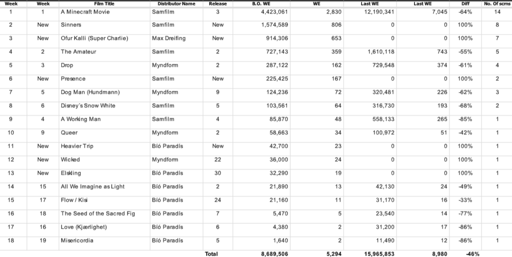Þannig var Minecraft með um 4,5 milljónir í tekjur eftir sýningar síðustu helgar á meðan nýja myndin Sinners náði 1,6 milljónum. Samanlagt er Minecraft komin í 21 milljón í tekjur frá frumsýningu.