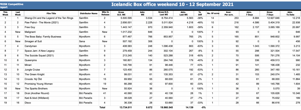Hvolpasveitinni tókst þó ekki alveg að sigra þursana hjá Marvel Studios enda ríghélt ævintýramyndin Shang-Chi and the Legend of the Ten Rings toppsæti sínu frá vikunni áður. Hátt í þrettán þúsund gestir hafa flykkst á þessa Marvel-mynd sem hlotið hefur stórgóðar viðtökur víða um heim.