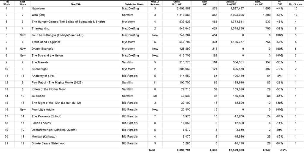 Nýju myndirnar þrjár, Jólin hans Bangsa, Dream Scenario og The Boy and the Heron raða sér í fimmta, sjöunda og áttunda sætið. Þess ber að geta að síðasttalda myndin er toppmynd helgarinnar í Bandaríkjunum.
