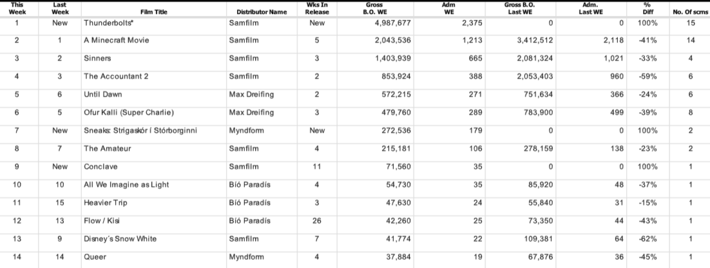 Það er komin ný kvikmynd á topp íslenska bíóaðsóknarlistans og hún er ekki af verri endanum. Ofur/andhetjumyndin Thunderbolts* þaut efst á listann og ruddi Minecraft niður í annað sætið en Minecraft hefur notið gríðarlega vinsælda síðustu vikur.