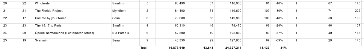 Önnur vinsælasta mynd landsins er ný á lista, njósnatryllirinn Red Sparrow með Jennifer Lawrence í aðalhlutverki, og í þriðja sæti listans og niður um eitt á milli vikna, er gamanmyndin Game Night.