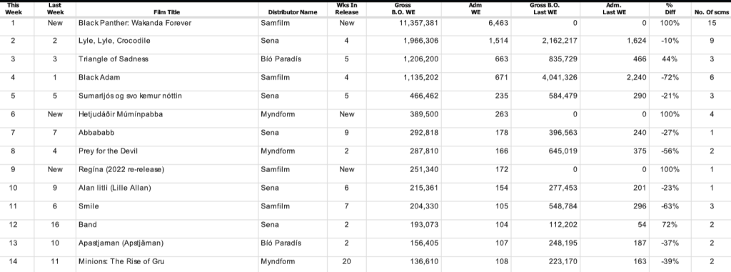 Það er óhætta að segja að Marvel ofurhetjumyndin Black Panther: Wakanda Forever hafi komið séð og sigrað um helgina í bíósölum landsins. Hvorki fleiri né færri en tæplega 6.500 manns borguðu sig inn til að sjá myndina og tekjurnar voru hátt í 11,5 milljónir króna. Kvikmyndin var sýnd í 15 sölum um helgina.