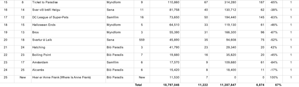 Í öðru sæti listans er sem fyrr fjölskyldumyndin Kalli káti krókódíll og líka áfram í því þriðja er verðlaunamyndin Triangle of Sadness.