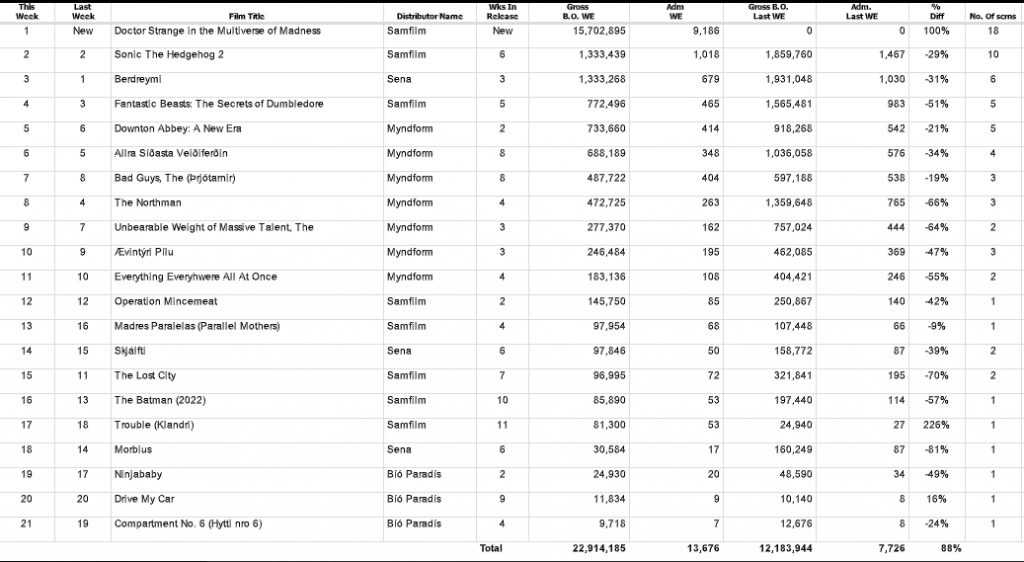 Doctor Strange in the Multiverse of Madness kom sá og sigraði á íslenska bíóaðsóknarlistanum um síðustu helgi og halaði inn næstum sextán milljónum króna í miðasölunni. Eins og sést á meðfylgjandi töflu var myndin sýnd í átján bíósölum og rúmlega níu þúsund manns fóru í bíó að sjá Marvel hetjurnar.