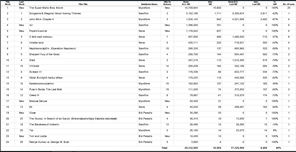 Pípararnir Mario og Luigi í The Super Mario Bros. Movie komu sáu og sigruðu á íslenska bíóaðsóknarlistanum um helgina þegar næstum ellefu þúsund manns mættu í bíó til að upplifa ævintýri þeirra. Toppmynd síðustu viku, Dungeons and Dragons Honor Amoung Thieves, datt niður í annað sætið og John Wick í það þriðja.