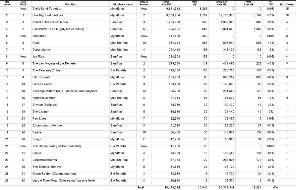 Tröllin litríku úr Tröll 3 eða Trolls Band Together eins og myndin heitir á íslensku, gerðu sér lítið fyrir og skelltu sér á topp íslenska bíóaðsóknarlistans um síðustu helgi. Tekjur voru 9,7 milljónir króna og gestir 6.300.