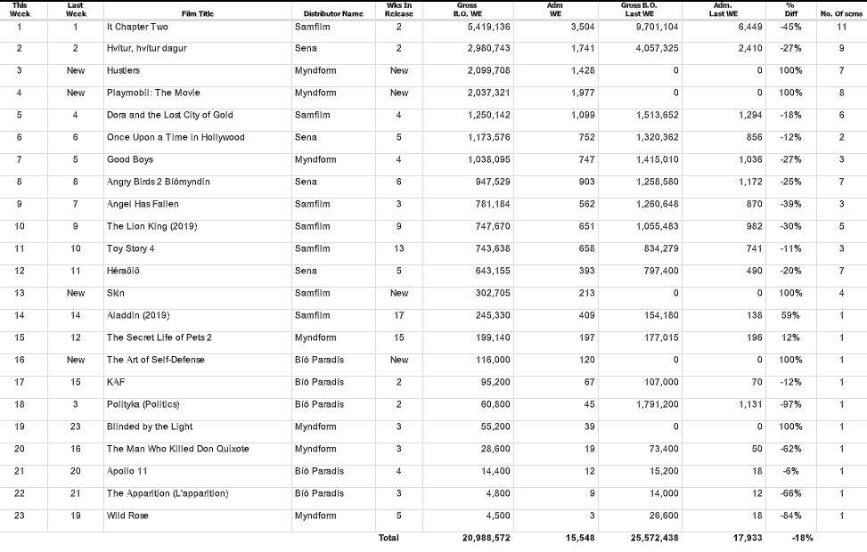 Íslendingar hafa lengi verið hrifnir af hrollvekjum, sem sýnir sig best í því að It Chapter Two er núna aðra vikuna í röð á toppi íslenska bíóaðsóknarlistans. Myndin fjallar um hinn miður geðslega trúð Pennywise, sem hrellir börnin í Derry, en lúðafélagið kemur til hjálpar eins og í fyrri myndinni. Sama kvikmyndin er einnig í öðru sæti listans og var þar í síðustu viku, íslenska myndin Hvítur, hvítur dagur, sem hlotið hefur góðar viðtökur bæði áhorfenda og gagnrýnenda, en myndin er tilnefnd til kvikmyndaverðlauna Norðurlandaráðs.