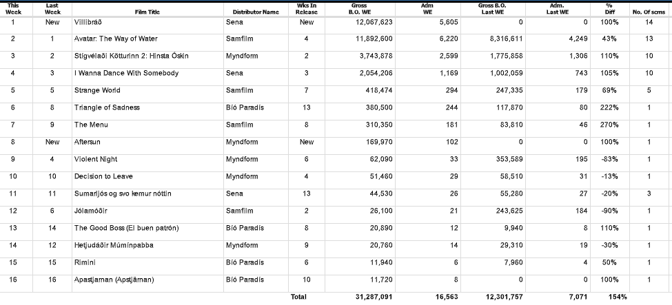 Stórmyndin Avatar: The Way of Water þurfti að gefa toppsæti íslenska bíóaðsóknarlistans eftir til íslensku kvikmyndarinnar Villibráðar um síðustu helgi. Mjótt var á munum en tekjur Villibráðar voru 12,1 milljón króna en tekjur Avatar: The Way of Water voru 11,9 milljónir króna í öðru sæti listans.