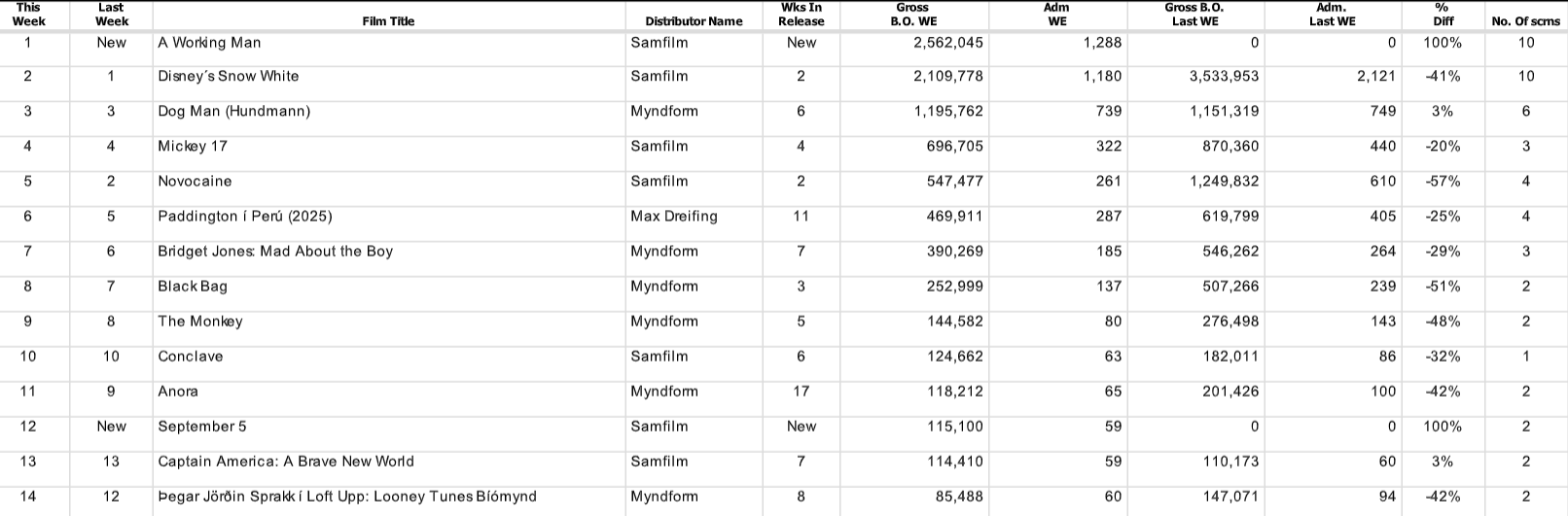 Jason Statham myndin A Working Man, eða Vinnumaðurinn, ný á lista, kom sá og sigraði, á íslenska bíóaðsóknarlistanum um helgina og ruddi þar með Disney myndinni um Mjallhvíti úr toppsætinu niður í sæti númer 2.