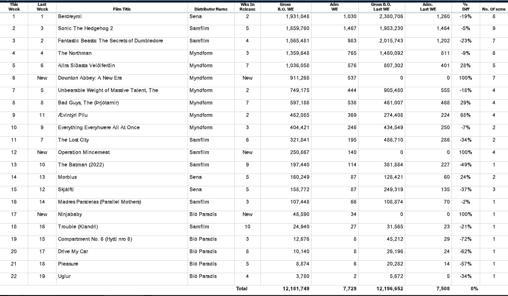 Það vekur athygli að Sonic The Hedgehog 2 og Fantastic Beasts: The Secrets of Dumbledore, hafa sætaskipti. Sonic er nú í öðru sæti en var í því þriðja í síðustu viku og Fantastic Beasts er í þriðja sæti en var í öðru sæti í síðustu viku. Myndirnar hafa báðar verið í meira en mánuð í bíó.