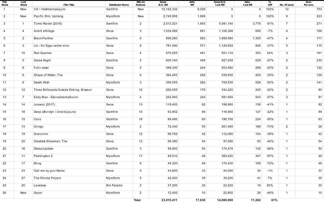 Í öðru sæti á íslenska bíóaðsóknarlistanum er önnur ný kvikmynd, Pacific Rim: Uprising, toppmynd bandaríska aðsóknarlistans um helgina. Þriðja sætið féll svo toppmynd síðustu viku í skaut, ævintýramyndinni Tomb Raider.