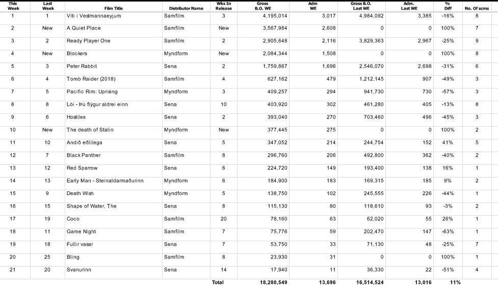 Þriðju vikuna í röð situr íslenska fjölskyldu- og fótboltakvikmyndin Víti í Vestmannaeyjum á toppi íslenska bíóaðsóknarlistans, en hún fékk harða samkeppni frá kvikmyndinni í öðru sæti, hrollvekjunni A Quiet Place, sem er ný á lista. Sú síðarnefnda fjallar um fjölskyldu sem þarf að hafa alveg hljóð, annars ráðast á þau dularfullar verur, sem eru að hrella mannkynið allt.