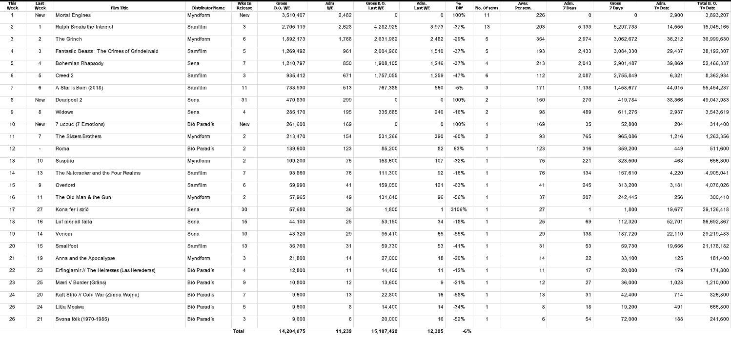 Tvær „nýjar“ kvikmyndir eru á listanum til viðbótar. Beint í áttunda sætið fór barnaútgáfan af Deadpool 2, Once Upon a Deadpool og beint í 10. sætið fór pólska myndin 7 Emotions.