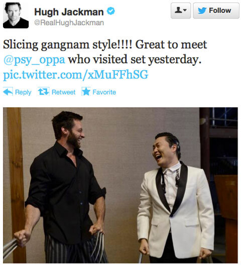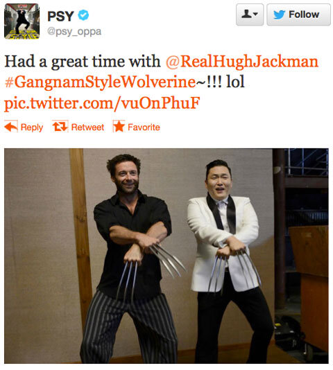 Eins og sést í vídeóinu fer vel á með félögunum, en Jackman hefur lánað Psy Wolverine klær til að dansa með: